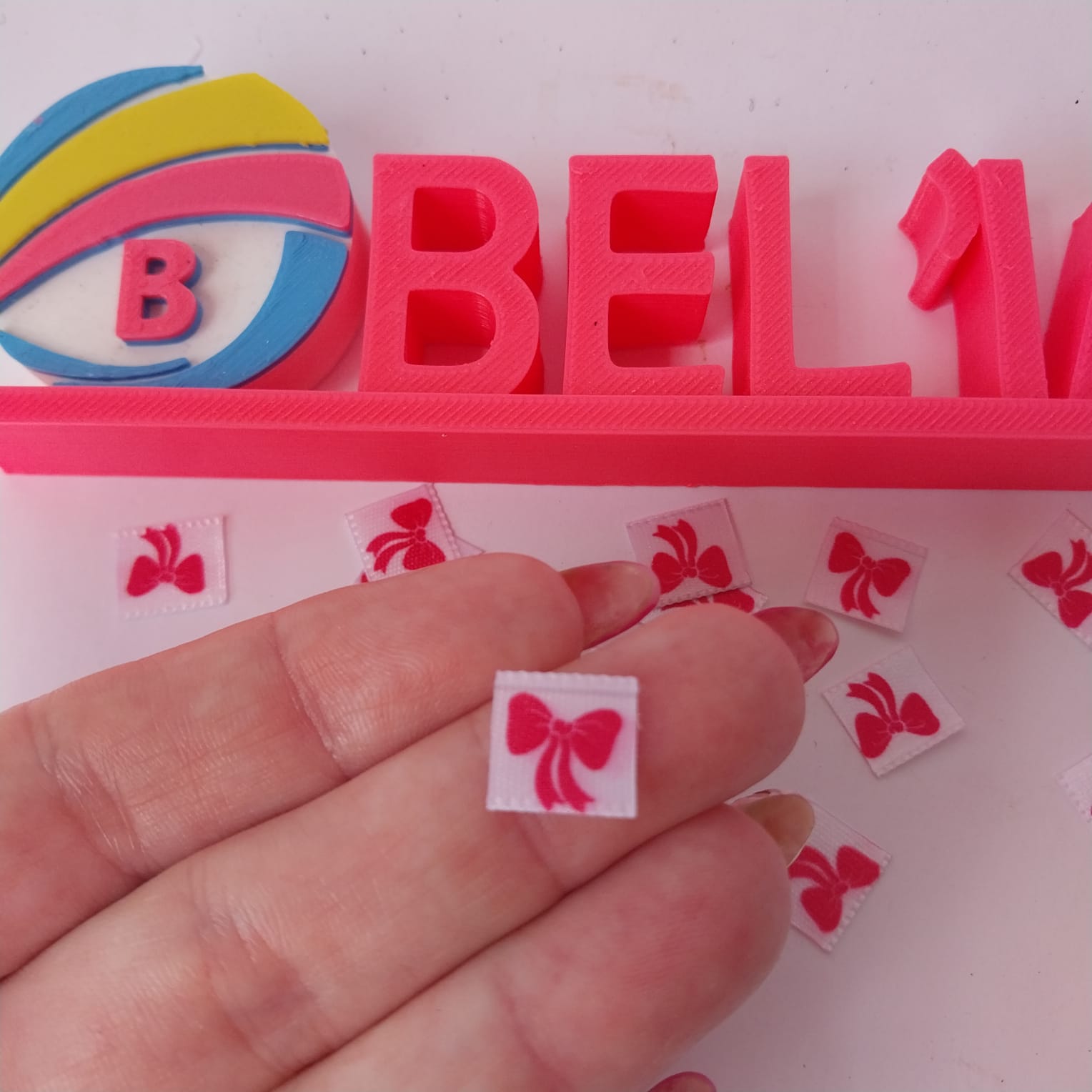 Etiquetas em cetim, 1x1cm, com lacinho estampado. pacote com 50 unid. Já irão cortadas e seladas para seu uso.